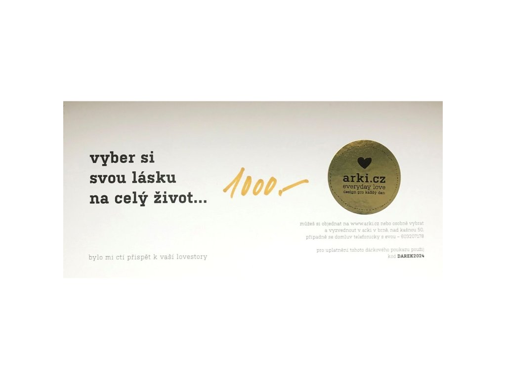 Naše vouchery jsou tištěné na tvrdý bílý papír se zlatou samolepkou arki.cz. Rádi na něj napíšeme věnování podle vašich představ, stačí jej dopsat do poznámky v objednávce. Nebo si ho můžete dotvořit sami doma podle svých představ.