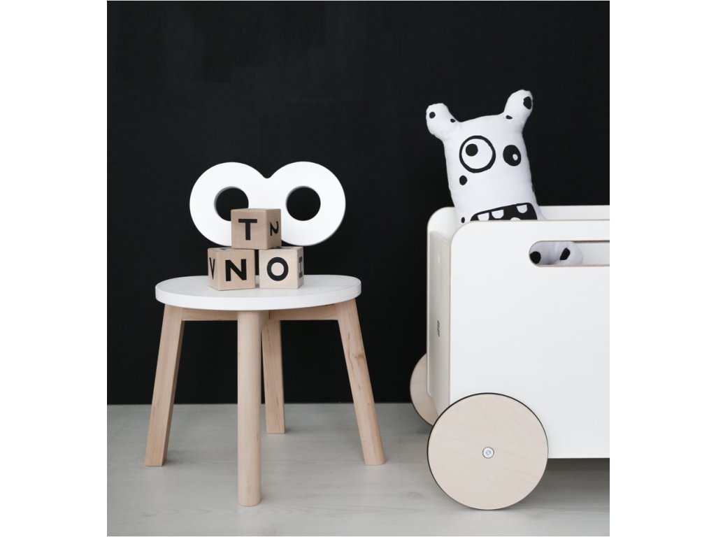 Dětská židle s kruhovým sedákem se seřízlým okrajem, který odráží tvar půlměsíce dětského stolu. Je tak pěkná, že se z ní možná později stane noční stolek u větší postele. A ty OO – jsou symbolem nekonečna, očí sovy, brýlí, kol vlaků nebo... je to všechno na vaší (dětské) představivosti. Navrženo a vyrobeno v Evropě.