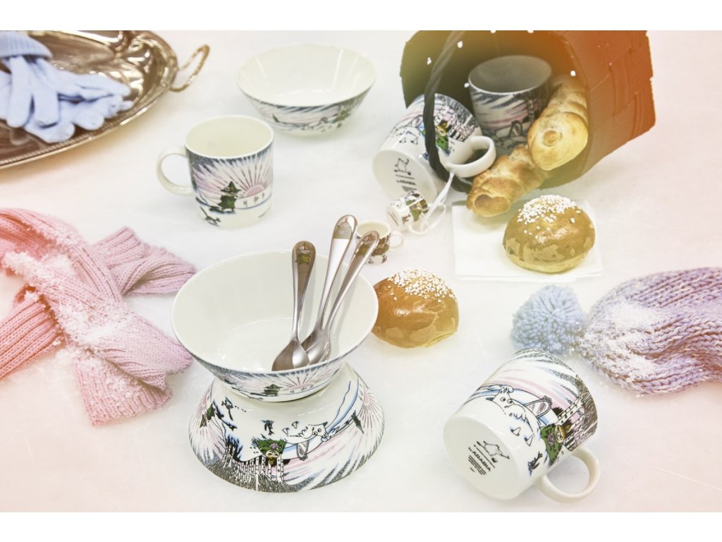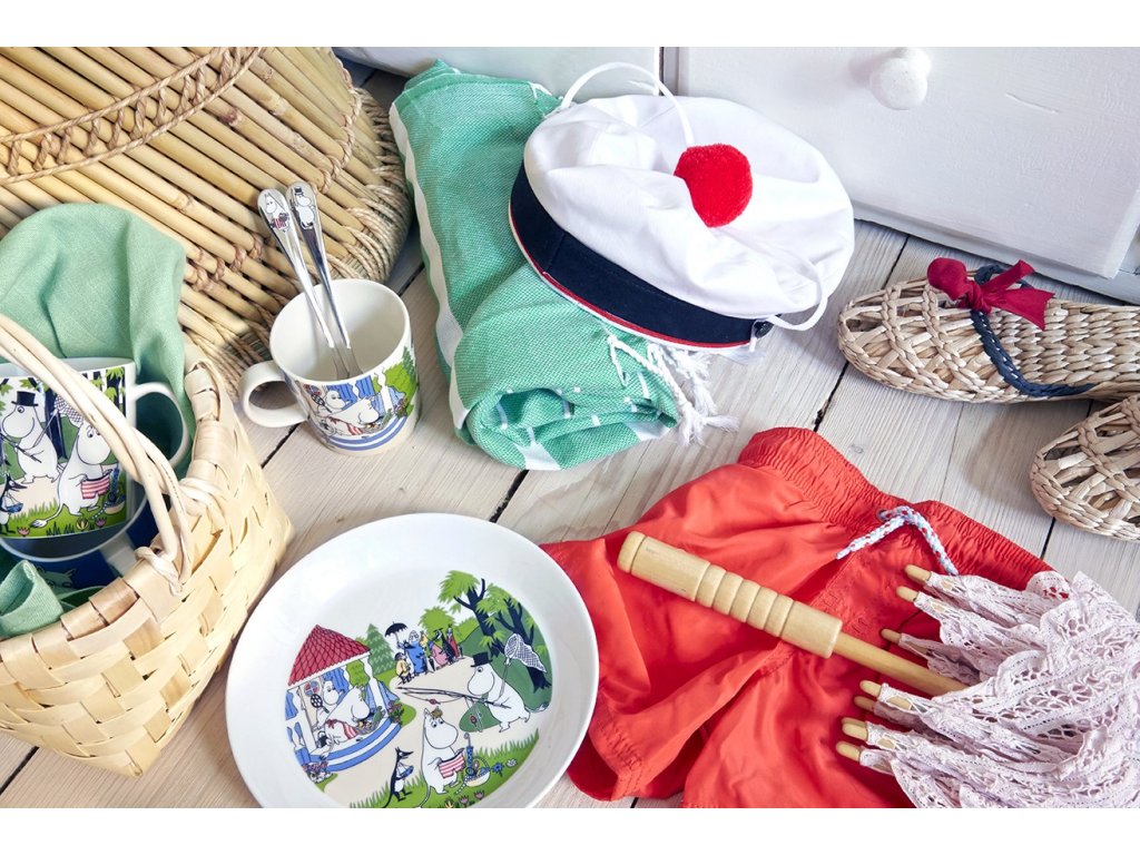 Moomin by Arabia, jak již název napovídá, spadá pod finskou značku designového nádobí Arabia, založenou v roce 1873. Okouzlující ilustrace na porcelánovém a skleněném nádobí a nyní i nerezových příborech vypráví příběh ze slavných dětských knížek o Mumincích, rodině roztomilých bílých trolů, kteří spolu se skřítky a zvířátky z pohádkového údolí zažívají dobrodružství a čelí různým nesnázím.