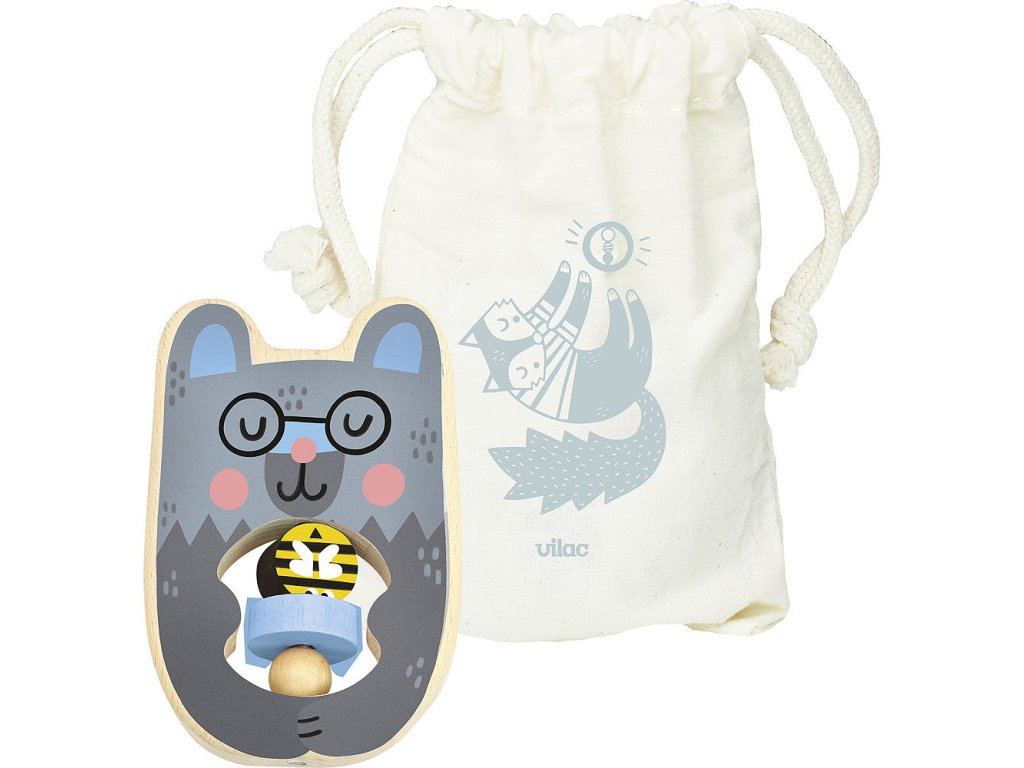 Krásné dřevěné chrastítko s motivem medvídka. Uprostřed 3 barevné korálky, které příjemně chrastí. Baleno v textilním pytlíku, je ideálním narozeninovým dárkem.