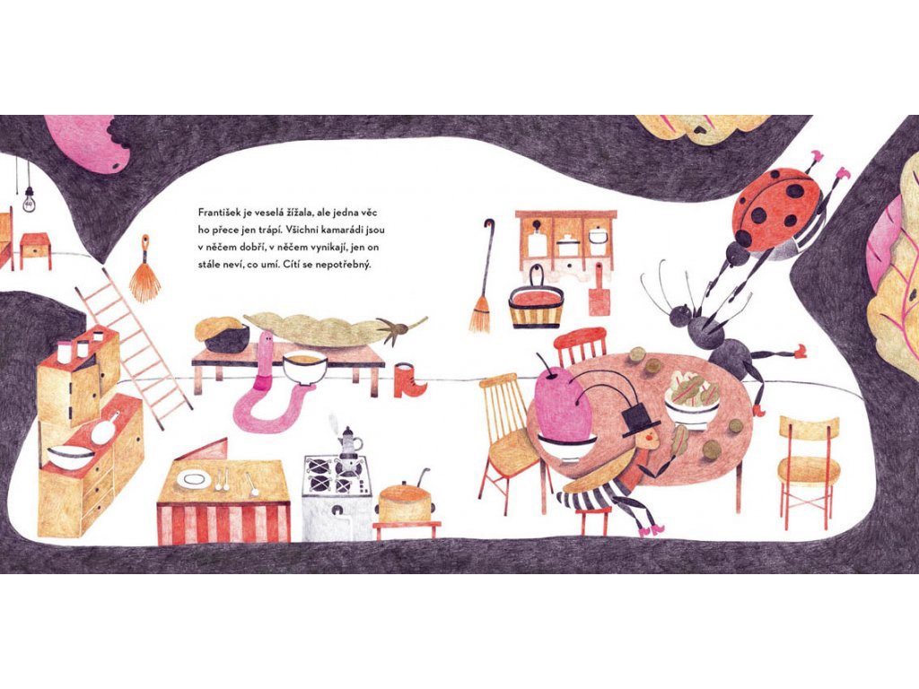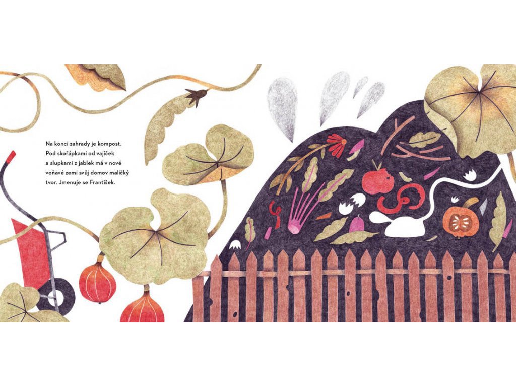 Na konci zahrady je kompost, kde pod skořápkami od vajíček a slupkami z jablek má v nové voňavé zemi svůj domov maličký tvor. Jmenuje se František... Půvabně ilustrovaná kniha o potřebě sdílení pocitu, že každý máme na této zemi svoje místo. I když se občas cítíme bezvýznamně, jako nějaká malá, zdánlivě nepotřebná žížala.