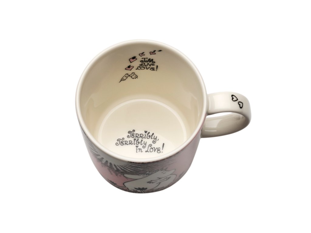 Hrnek ze sady nádobí s Mumínky od finské značky Arabia. Na růžovém podkladu najdeme nerozlučnou zamilovanou dvojici Mumínka a slečnu Ferku. S motivem lásky, která je v Mumíním domě všudypřítomná, si můžete pořídit i misku. A nově také hrníček v modrém provedení.