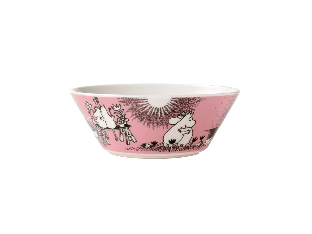 Miska ze sady nádobí s Mumínky od finské značky Arabia. Na růžovém podkladu najdeme nerozlučnou zamilovanou dvojici Mumínka a slečnu Ferku. S motivem lásky, která je v Mmumíním domě všudypřítomná, si můžete pořídit i hrníček, mísu, ubrousky .....
