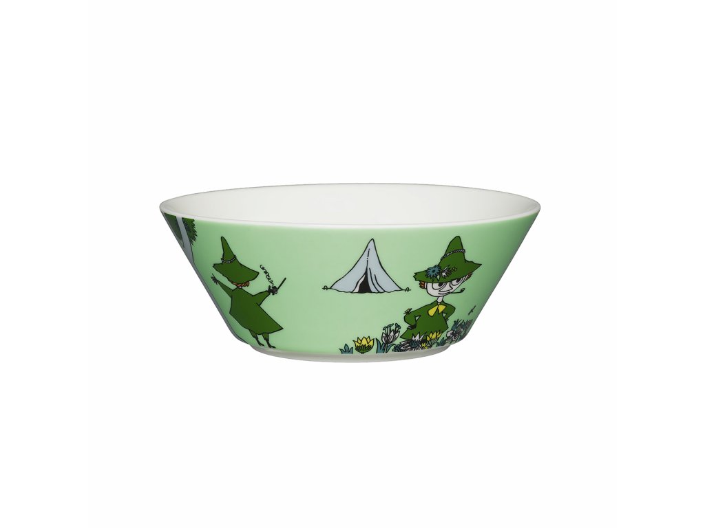 Miska ze sady nádobí s Mumínky od finské značky Arabia. Tahle miska bude skvělá na pořádnou müsli snídani. A na zeleném podkladu najdeme Šňupálka - Snufkin, který v zimě nespí, na rozdíl od Mumínků, a tak cestuje. Mumínkův nejlepší kamarád, ale samotář, a tak na cesty s ním Mumínek nemá šanci. Motiv Snufkin můžete najít i na hrníčku a talíři.
