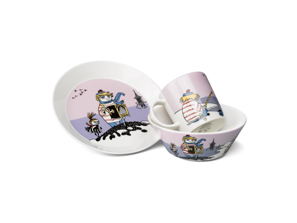 Miska ze sady nádobí s Mumínky od finské značky Arabia. Tahle miska bude skvělá na pořádnou müsli snídani. Na světle fialovém podkladu najdeme Tikyho - Tooticky, kamaráda Mumínků, který k nim přivedl neviditelnou holčičku Ninny. Dal jí na krk zvoneček, aby o ní všichni věděli. Kamaráda Tooticky můžete najít i na hrníčku a talíři.