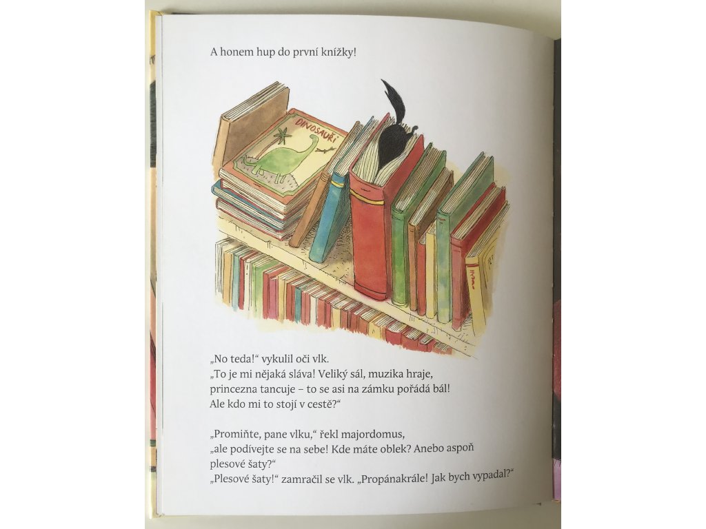 Bum! Z obrázkové knížky v přeplněné dětské knihovně vypadne vlk. Je celý popletený a bojí se. Jak se zase dostane zpátky? Skáče z jedné pohádky do druhé, potkává v nich ovečky, princezny a dokonce i dinosaury. A mezitím kde hořce pláče holčička s červeným čepečkem, protože vlk z její pohádky se někde ztratil. Jak tenhle zmatek dopadne, na to se podívejte sami...
