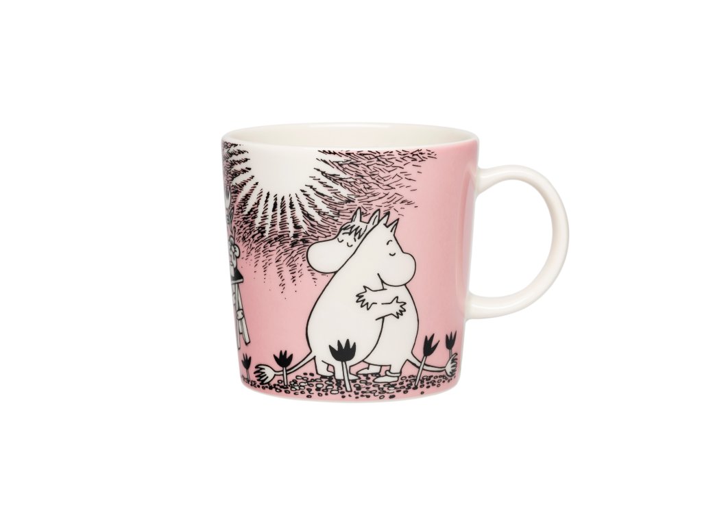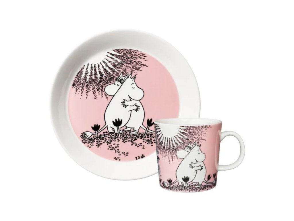 Hrníček a talíř v dárkovém balení ze sady nádobí s Mumínky od finské značky Arabia. Na růžovém podkladu najdeme nerozlučnou zamilovanou dvojici Mumínka a slečnu Ferku. S motivem lásky, která je v Mumíním domě všudypřítomná, si můžete pořídit i misku, lžičku, dózu a skleničky.
