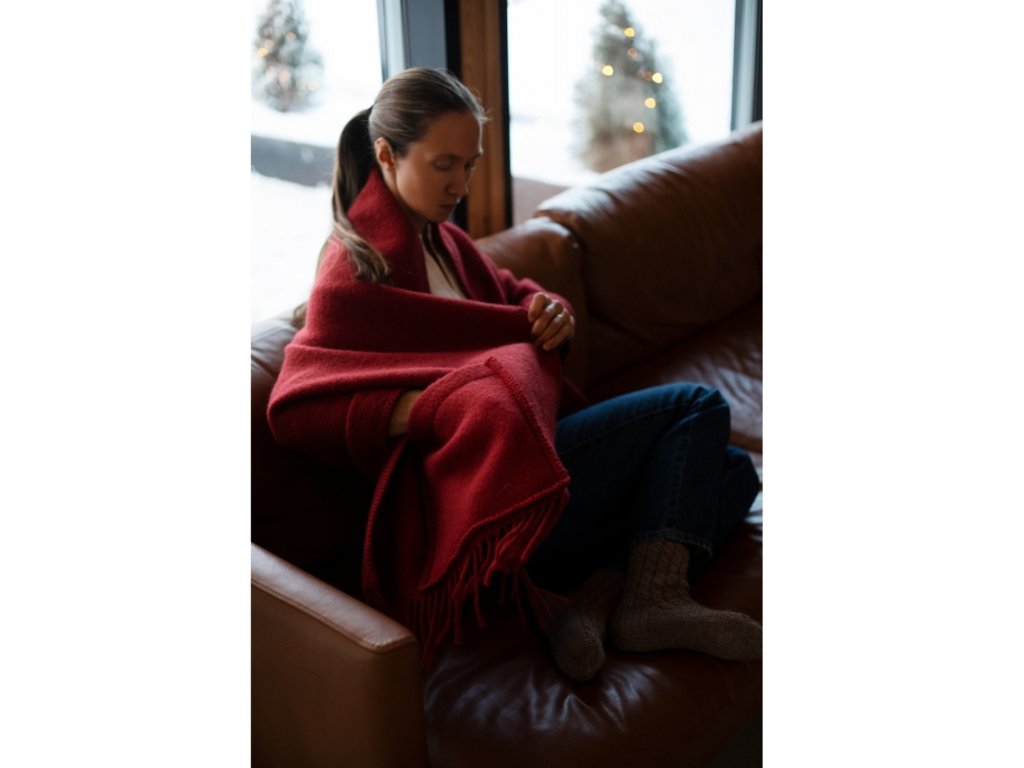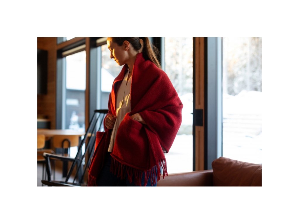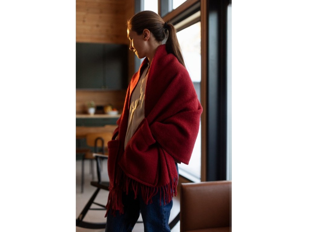 Na půlce cesty mezi šálou, svetrem a dekou... to je krásný a teplý šál z čisté vlny, který vás zahřeje venku i doma a vaše ruce už díky kapsám nebudou mrznout.