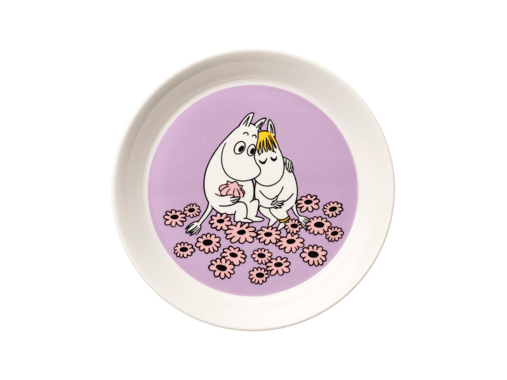 Talíř ze sady nádobí s Mumínky od finské značky Arabia. Na fialovém podkladu najdete zamilovaného Mumínka a slečnu Ferku v objetí. Talířek je ideální na snídani i svačinku a můžete jej doplnit hrníčkem, miskou i papírovými ubrousky ze stejné kolekce.