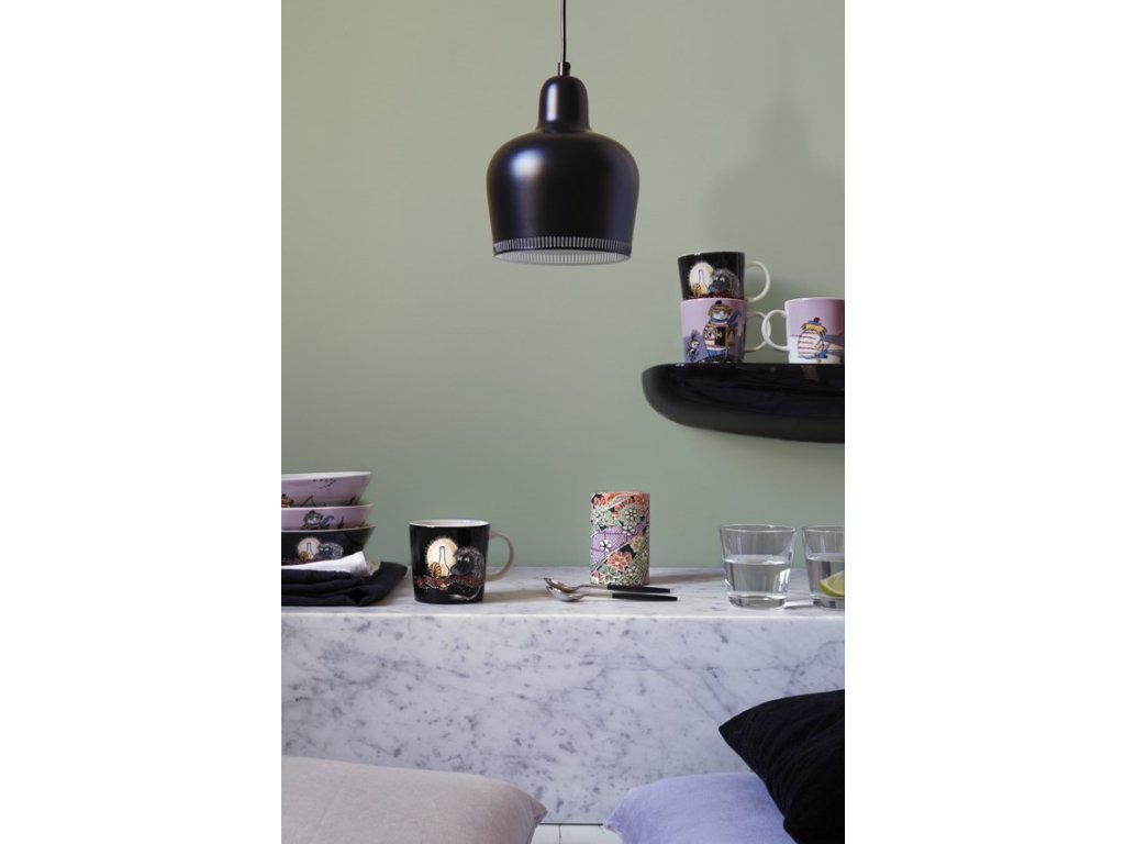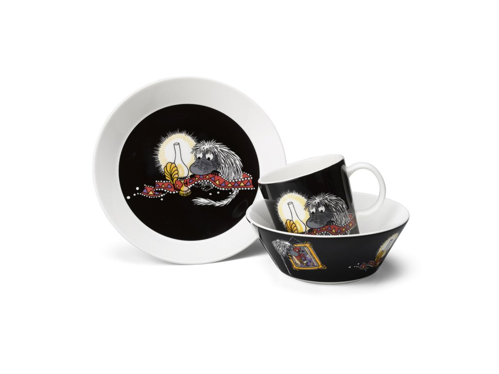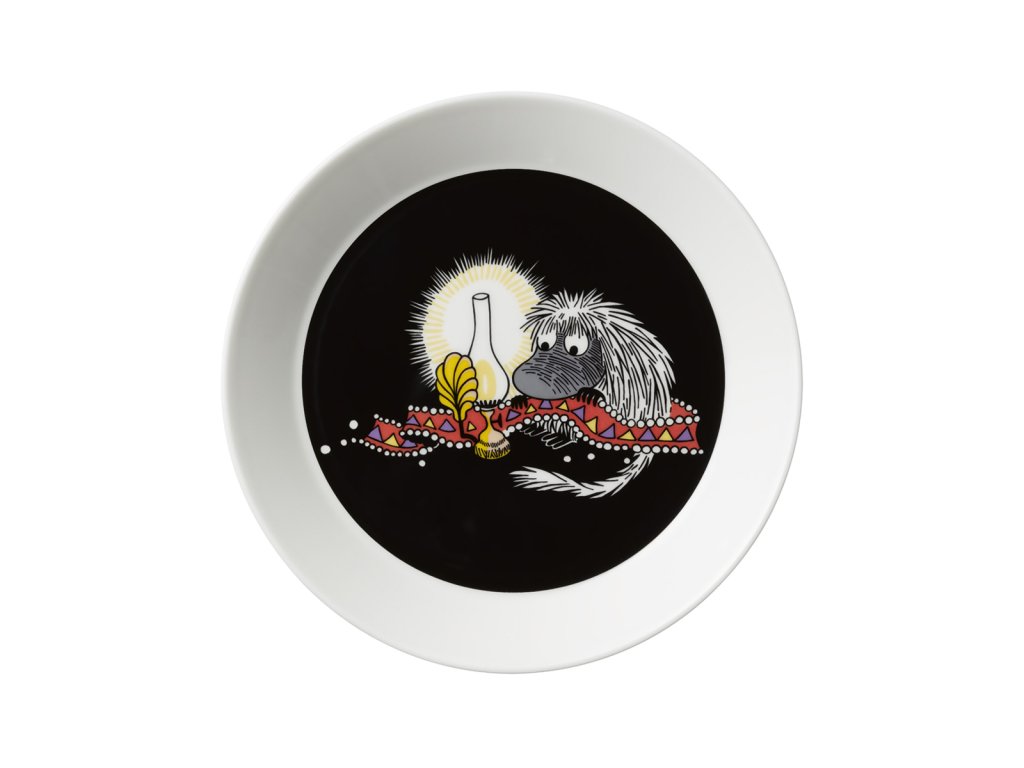 Talíř ze sady nádobí s Mumínky od finské značky Arabia. Na tajemně černém podkladu najdeme přímo imaginární postavu z knížek o Mumíncích, předka Mumínků. Ancestora můžete najít i na hrníčku, sklenici a misce.