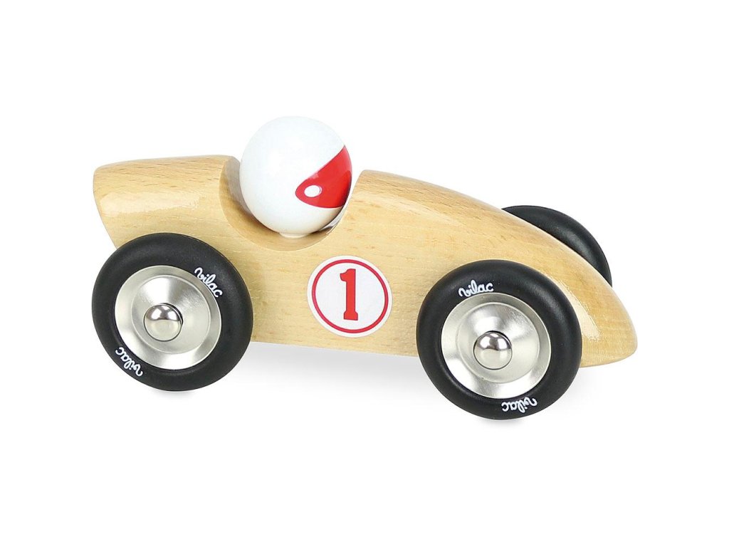 Malé závodní auto z lakovaného dřeva a pogumovanými velkými koly, ideální kamkoliv s sebou. Díky svému krásnému jednoduchému designu udělá radost i na poličce.